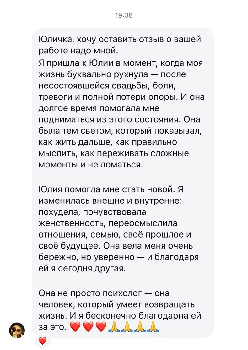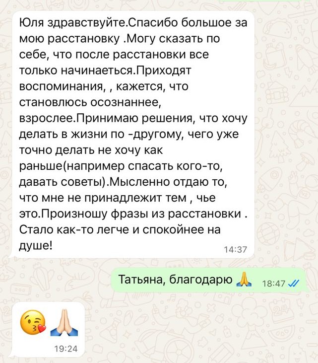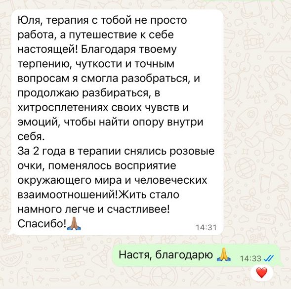 Я внимательно слушаю ваш запрос и предлагаю подходящий метод работы (гештальт, EMDR, IFS, расстановки или метод чувства Шароватова).
